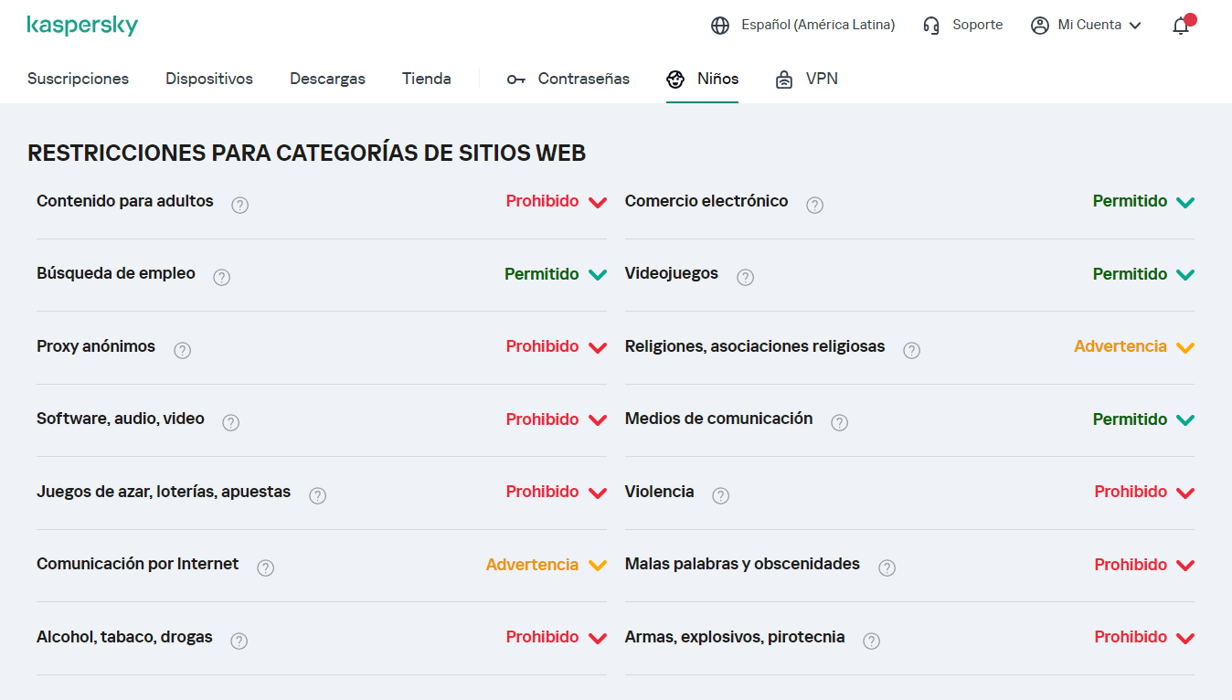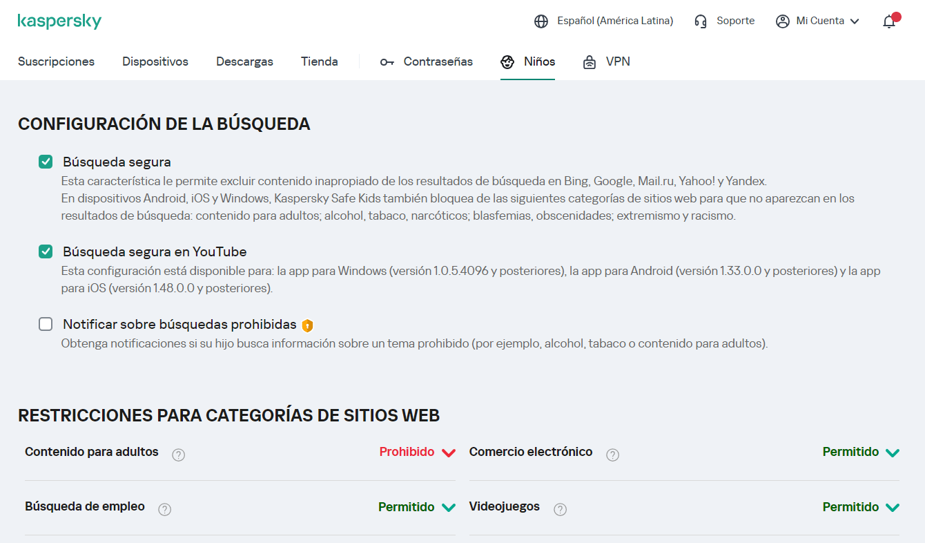 - Filtrado de Contenidos: Kaspersky Safe Kids permite a los padres filtrar y controlar el acceso a contenidos inapropiados en la web, asegurando que los niños naveguen en un entorno online seguro.