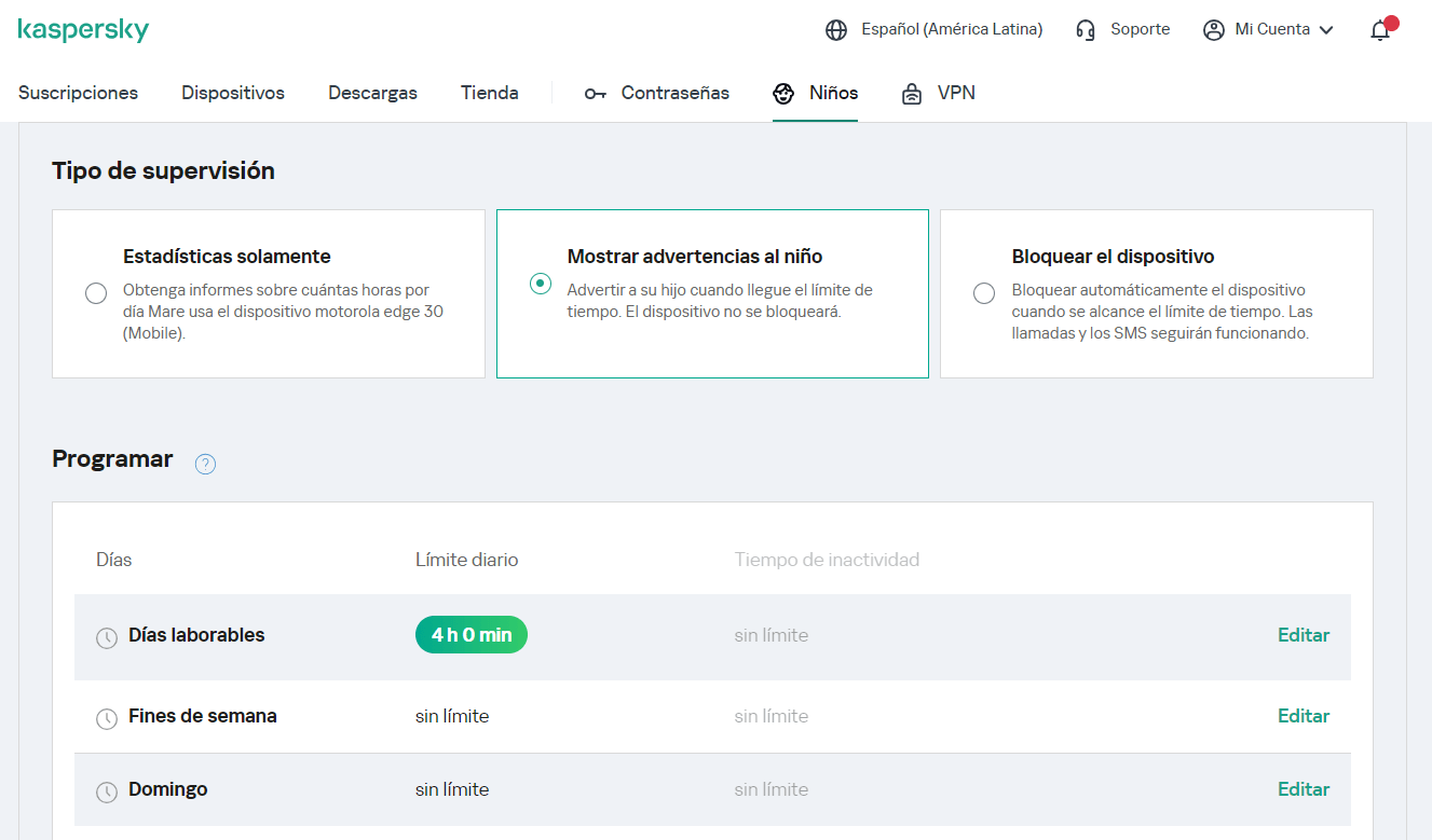 "KasperSky me ha resultado excelente, pude configurar limites horarios para que mis hijos tengan rutinas de uso mas saludables, y no se pasen el dia frente a una pantalla. Sin lugar a dudas, todos los padres deberian de implementar algo asi, permite promover mejores habitos y cuidar la salud de nuestros hijos.