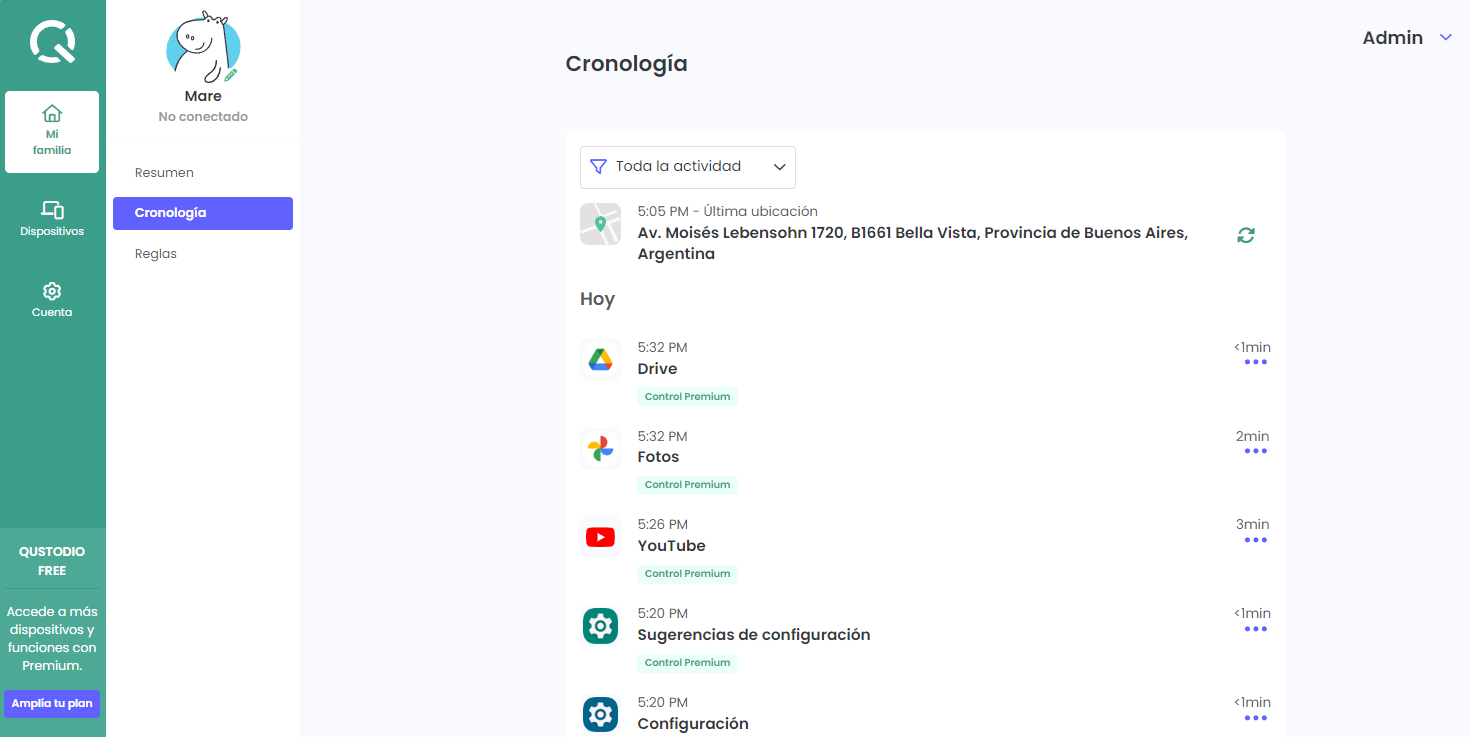 - Panel de Supervision: Qustodio te permite monitorear a través de su Web, o bien desde su App para móviles.