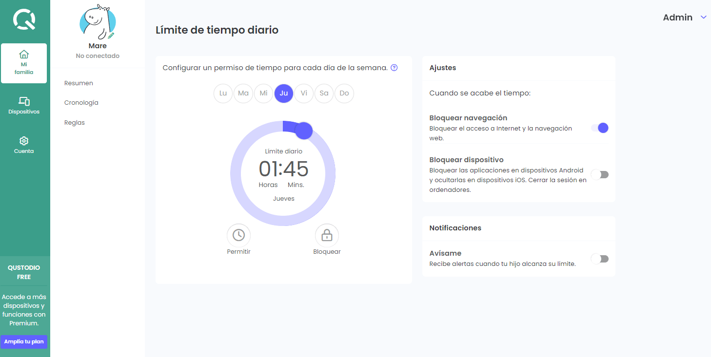 - Impulsar el uso equilibrado de las pantallas: Tenes la posibilidad de configurar horarios y tiempos de uso, en pos de generar una rutina saludable para su desarrollo, que contemple otras actividades importantes para su edad.